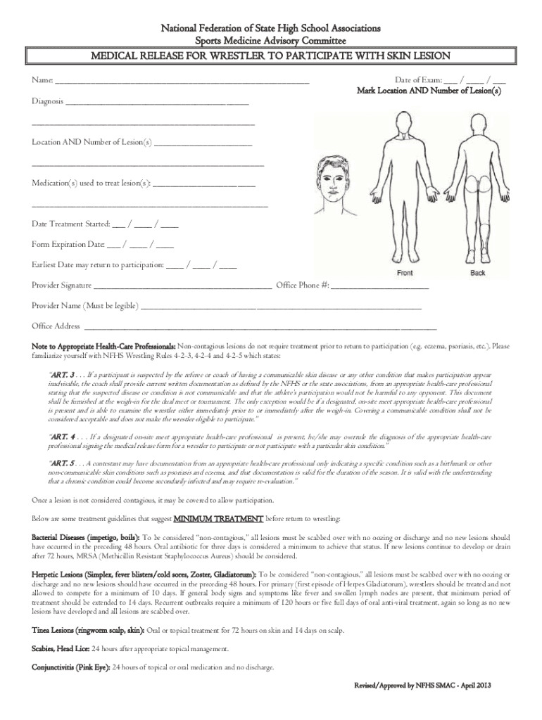 National Federation of State High School Associations Sports Medicine Advisory Committee MEDICAL RELEASE FOR WRESTLER TO PARTICIPATE WITH SKIN LESION Name: ___Date of Exam: ___ / ___ / ___ Mark Location
