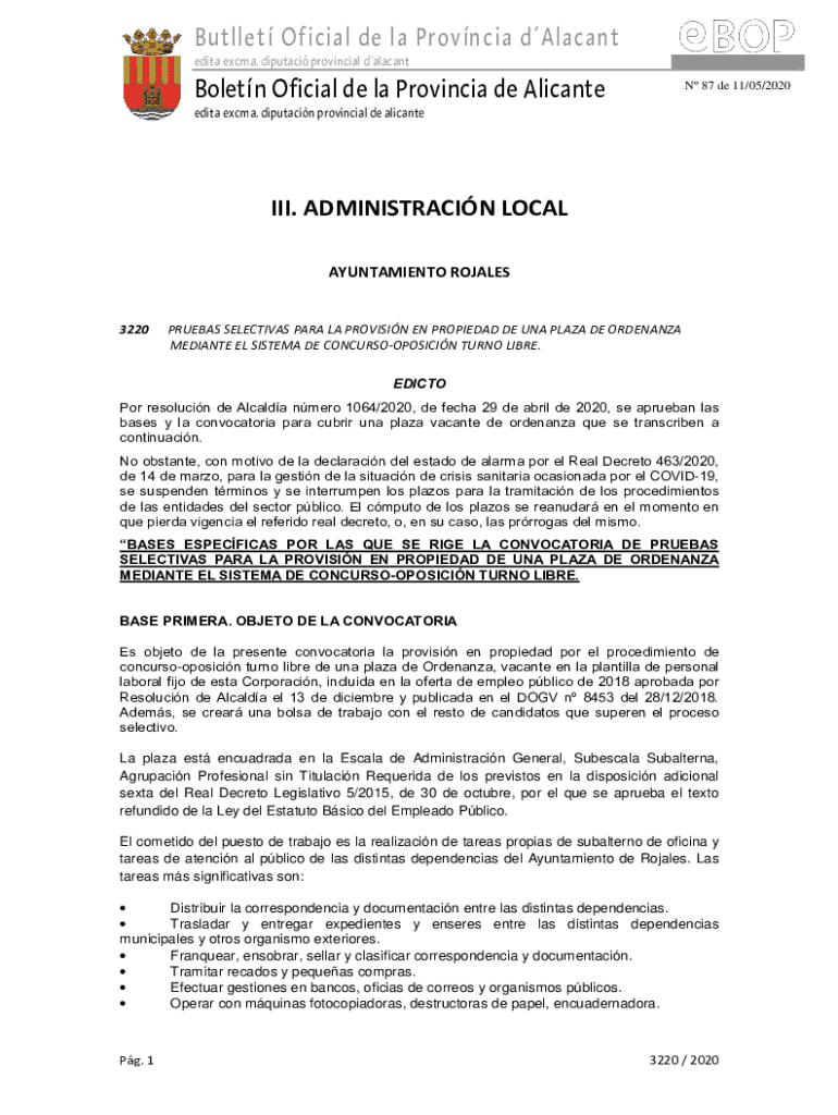 edit extra. Dipstick provincial dalacantBoletn Official DE la Provincial de AlicanteN 87 DE 11/05/2020edita extra. Deputation provincial de Alicante. ADMINISTRATION