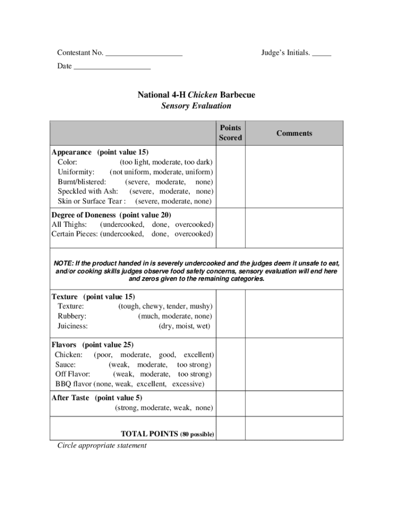 Contestant No. ___Judges Initials. ___Date ___National 4H Chicken Barbecue