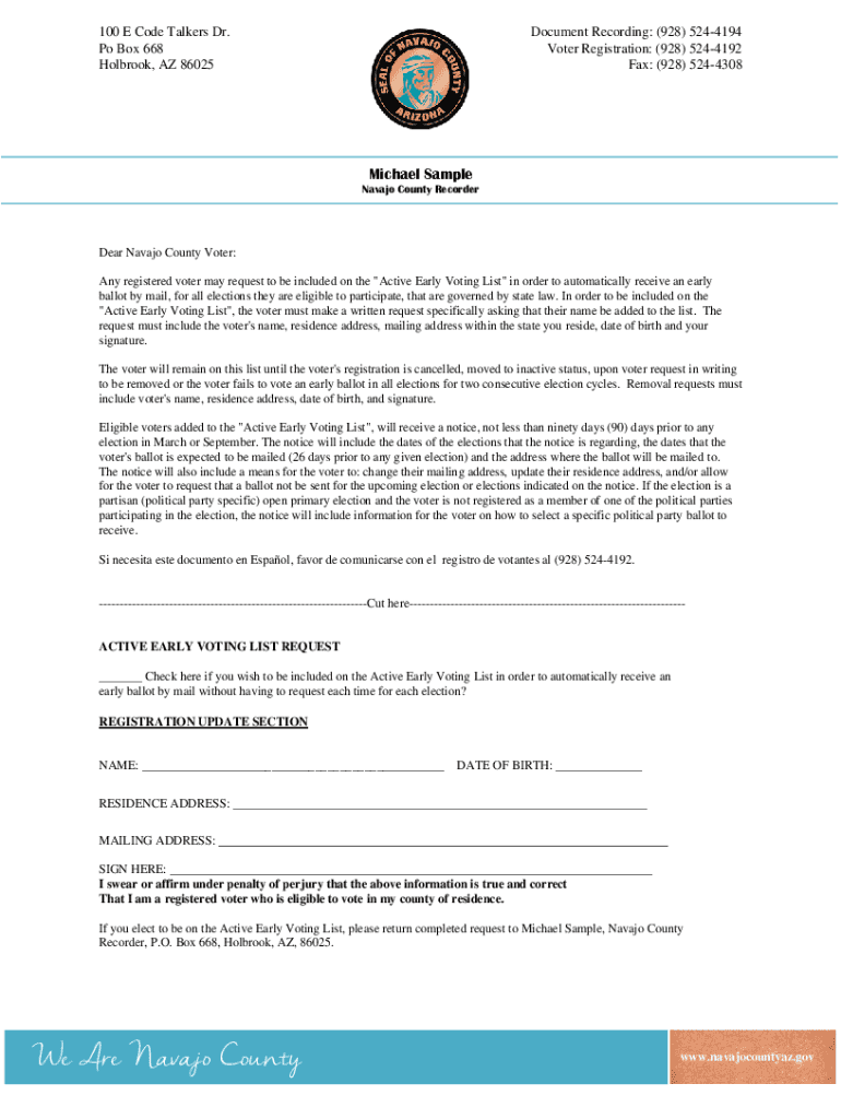 100 E Code Talkers Dr. Po Box 668 Holbrook, AZ 86025Document Recording: (928) 5244194 Voter Registration: (928) 5244192 Fax: (928) 5244308Michael Sample Navajo County RecorderDear Navajo County Voter: