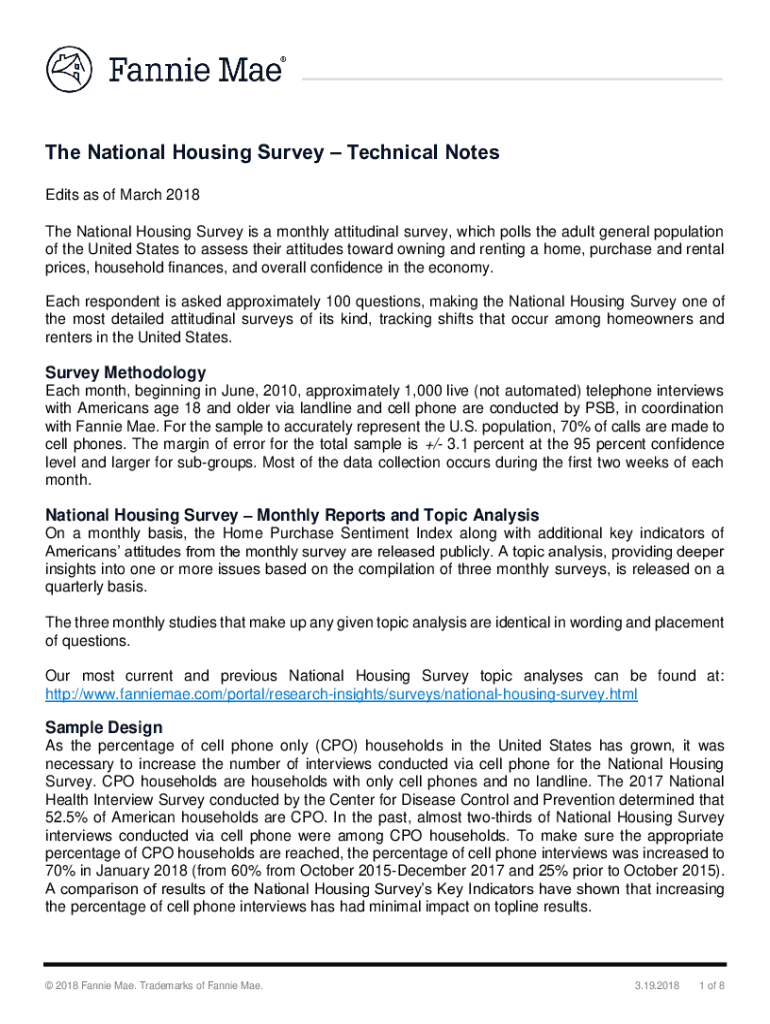 The National Housing Survey Technical Notes Edits as of March 2018 The National Housing Survey is a monthly attitudinal survey, which polls the adult general population of the United States to assess
