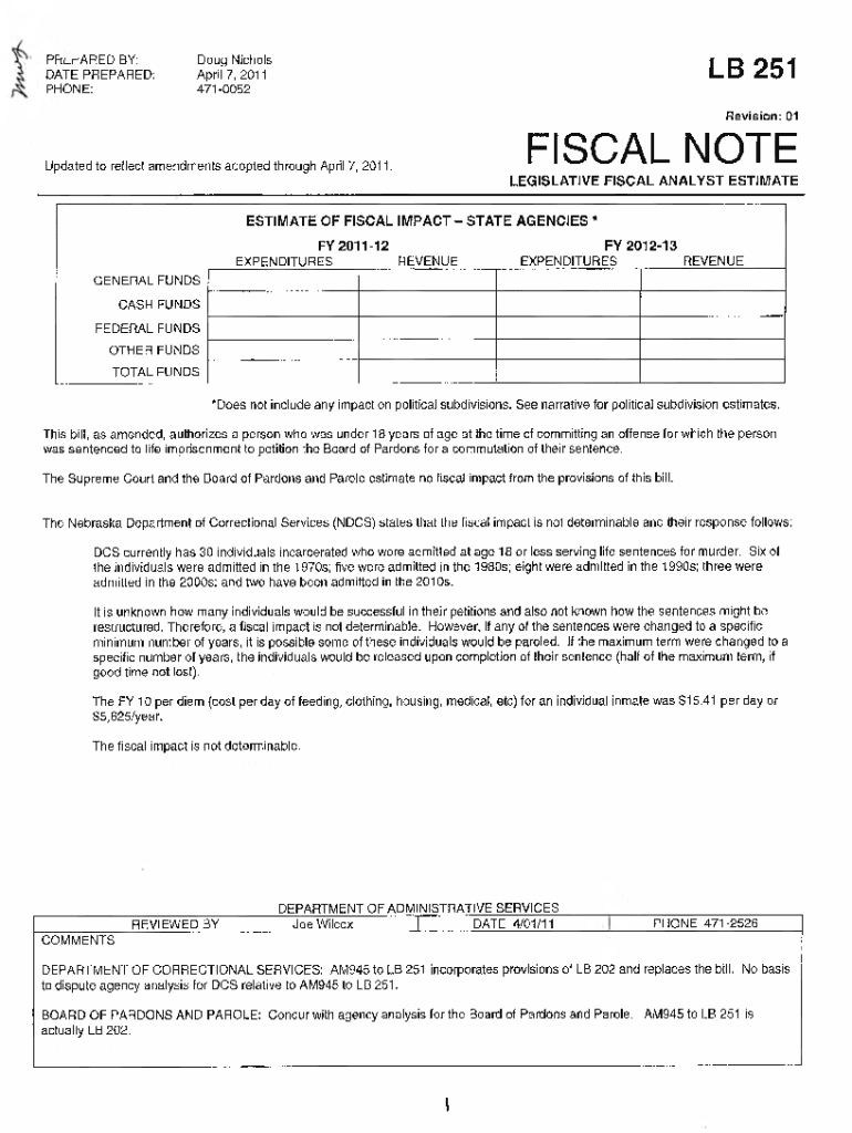 Revision: 01FISCAL NOTEUpdated to reflect amendments adopted through April 7, 2011.LEGISLATIVE FISCAL ANALYST ESTIMATE