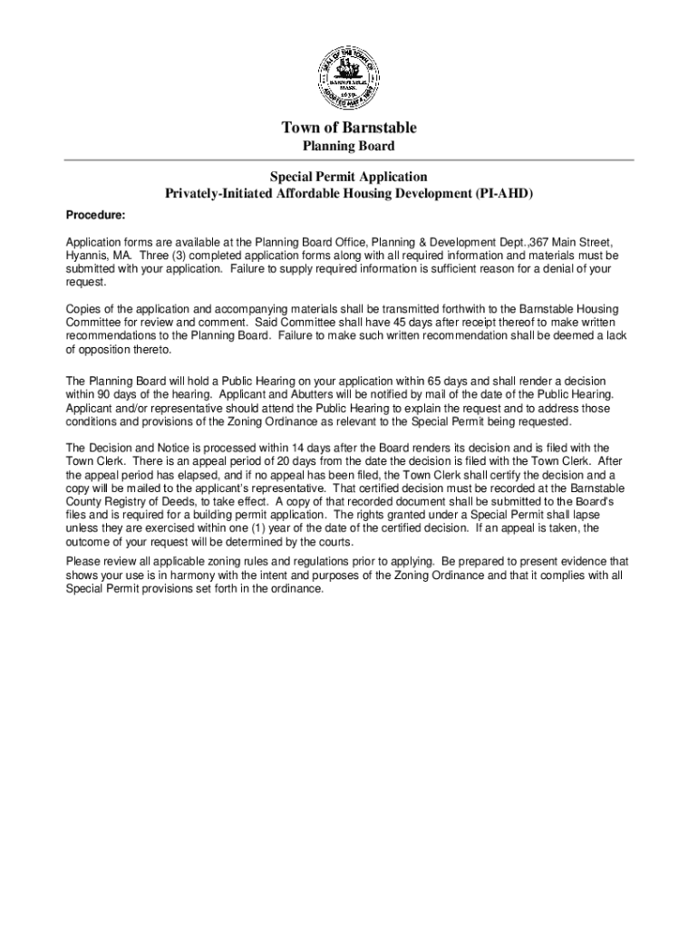 Town of Barnstable Planning Board Special Permit Application PrivatelyInitiated Affordable Housing Development (PI AHD) Procedure: Application forms are available at the Planning Board Office, Planning