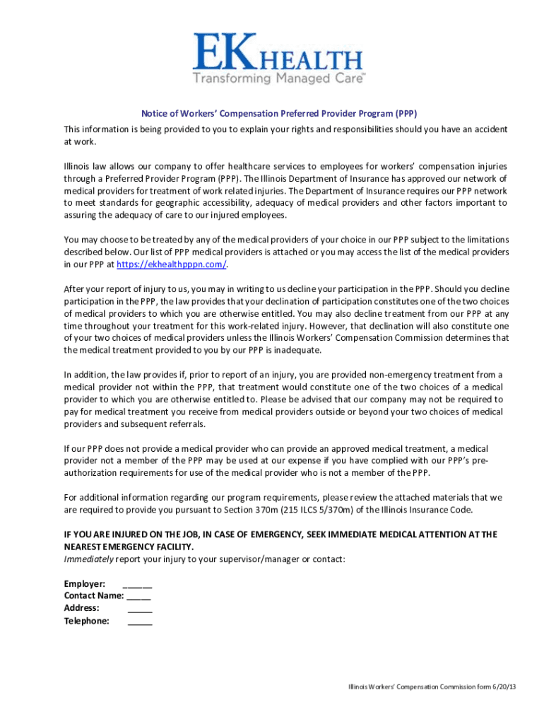 NoticeofWorkersCompensationPreferredProviderProgram(PPP) Thisinformationisbeingprovidedtoyoutoexplainyourrightsandresponsibilitiesshouldyouhaveanaccident artwork. Illinoislawallowsourcompanytoofferhealthcareservicestoemployeesforworkerscompensationinjuries