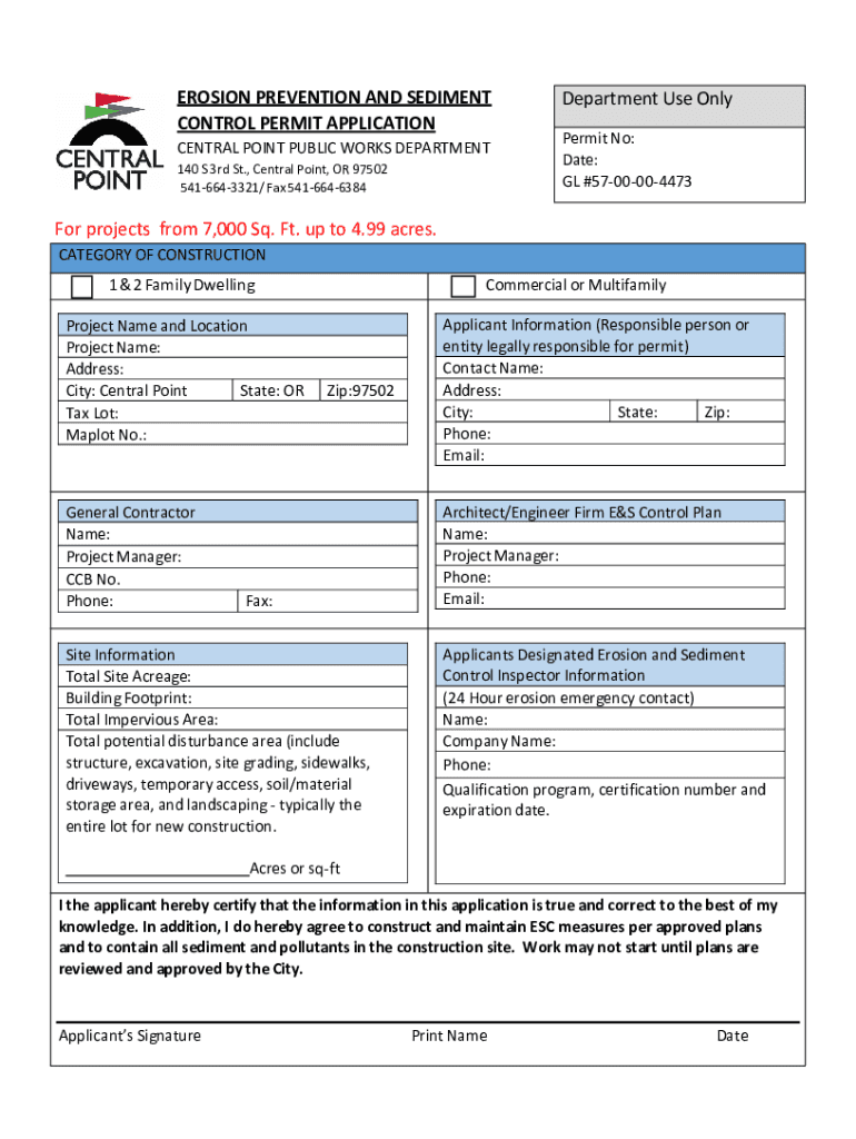 EROSION PREVENTION AND SEDIMENT CONTROL PERMIT APPLICATION CENTRAL POINT PUBLIC WORKS DEPARTMENT 140 S 3rd St., Central Point, OR 97502 5416643321/ Fax 5416646384Department Use Only Permit No: Date: