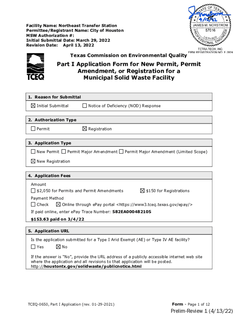 Facility Name: Northeast Transfer Station Permitted/Registrant Name: City of Houston MSW Authorization #: Initial Submittal Date: March 29, 2022, Revision Date: April 13, 2022Texas Commission on Environmental
