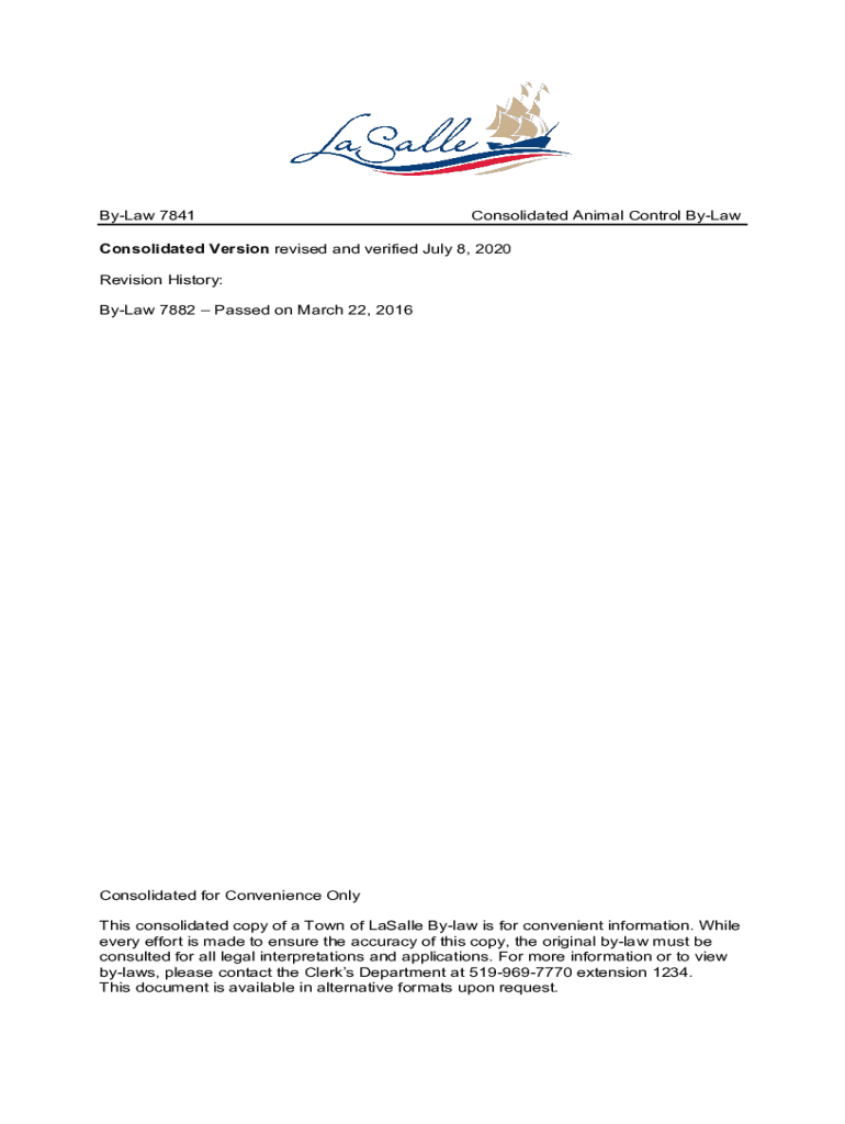 Bylaw 7841Consolidated Animal Control ByLawConsolidated Version revised and verified July 8, 2020, Revision History: Bylaw 7882 Passed on March 22, 2016Consolidated for Convenience Only This consolidated