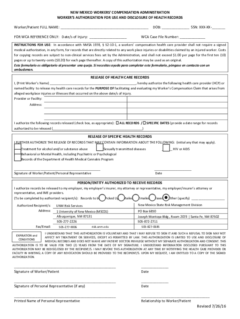 NEW MEXICO WORKERS COMPENSATION ADMINISTRATION WORKERS AUTHORIZATION FOR USE AND DISCLOSURE OF HEALTH RECORDS Worker/Patient FULL NAME: ___ FOR WPA REFERENCE ONLY: Date/s of Injury: ___DOB: ___ SSN: