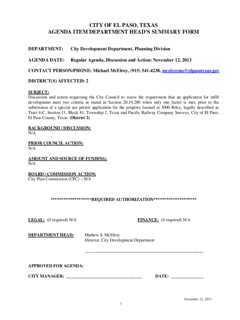 CITY OF EL PASO, TEXAS AGENDA ITEM DEPARTMENT HEADS SUMMARY FORM DEPARTMENT:City Development Department, Planning DivisionAGENDA DATE:Regular Agenda, Discussion and Action: November 12, 2013CONTACT
