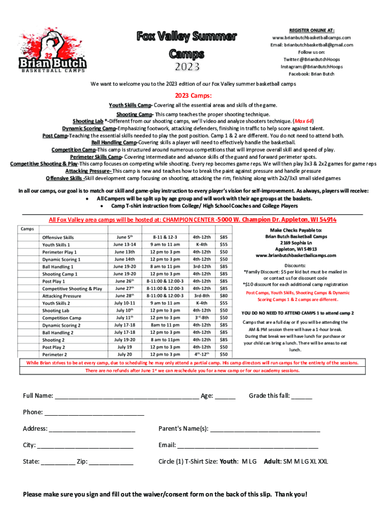 The registration forms for Brian Butch Basketball Camps in Appleton usually require basic personal information about the participant, emergency contact information, medical history, and waiver agreements.