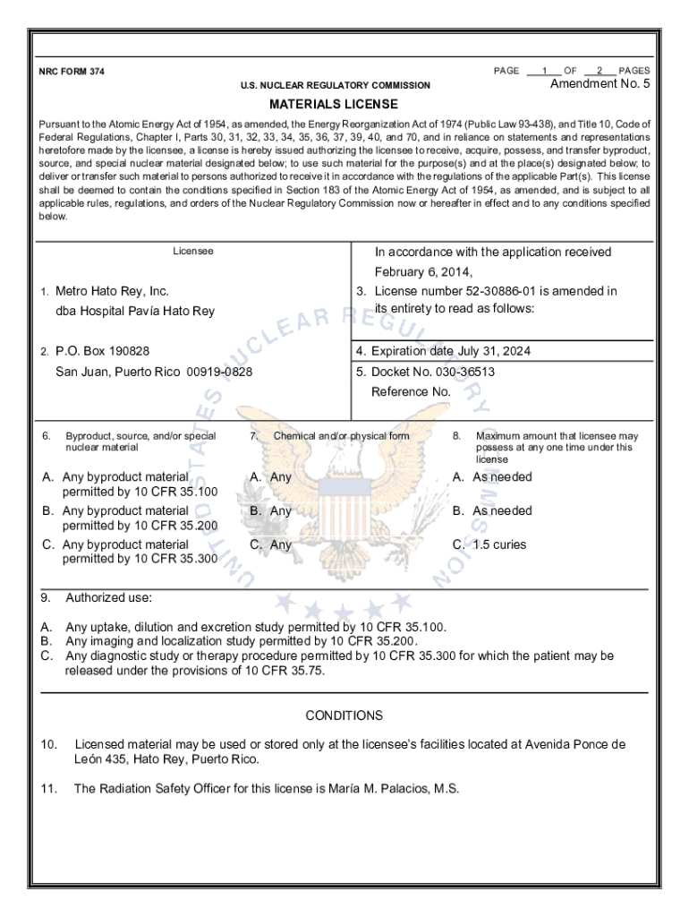 PAGE NRC FORM 3741OF2PAGESAmendment No. 5U. S. NUCLEAR REGULATORY COMMISSIONMATERIALS LICENSE Pursuant to the Atomic Energy Act of 1954, as amended, the Energy Reorganization Act of 1974 (Public Law