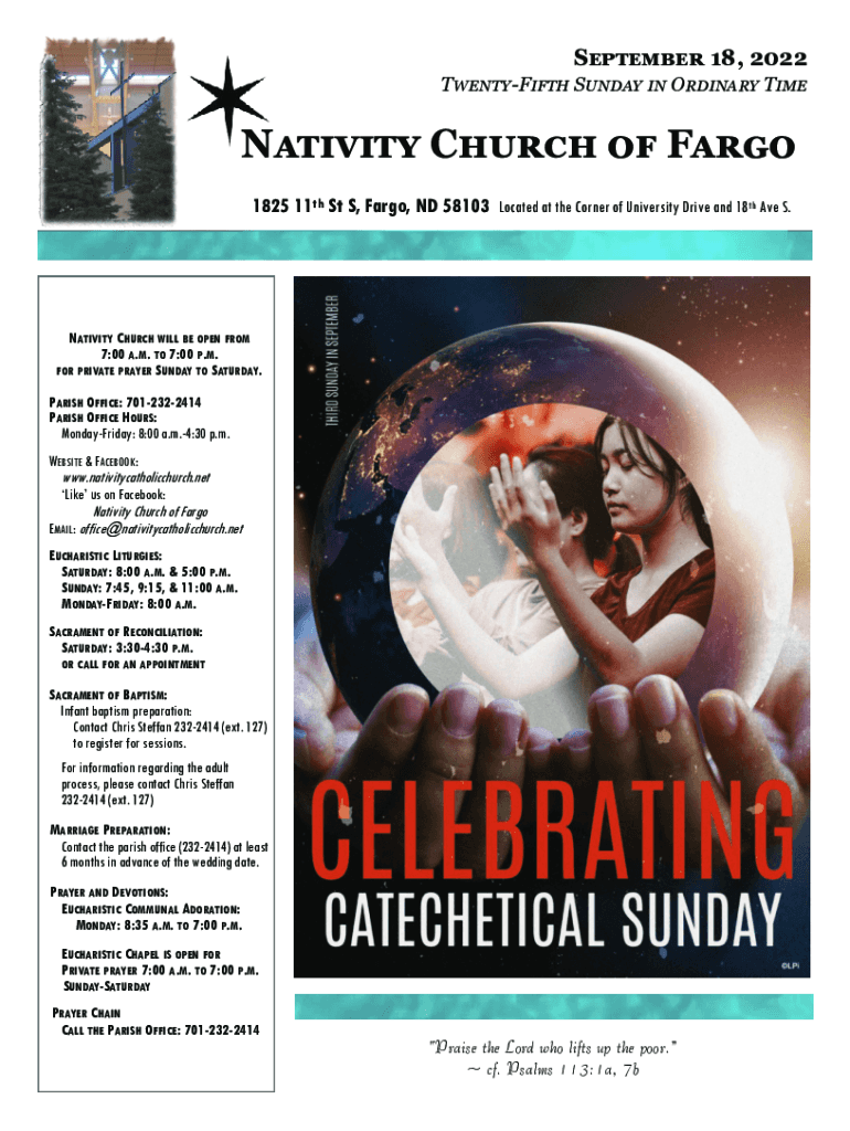 September 18, 2022, Twentieth Sunday in Ordinary Time Nativity Church of Fargo 1825 11th St S, Fargo, ND 58103Located at the Corner of University Drive and 18th Ave S.NATIVITY CHURCH WILL BE OPEN