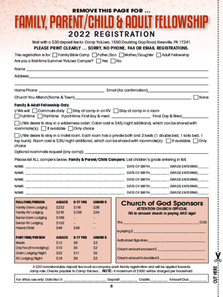 REMOVE THIS PAGE FOR FAMILY, PARENT/CHILD & ADULT FELLOWSHIP 20 22 REGISTRATION ON Mail with a $30 deposit fee to: Camp Bolivia, 1550 Doubling Gap Road, Neville, PA 17241. PLEASE PRINT CLEARLY SORRY,
