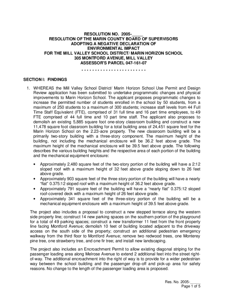 RESOLUTION NO. 2005___ RESOLUTION OF THE MARIN COUNTY BOARD OF SUPERVISORS ADOPTING A NEGATIVE DECLARATION OF ENVIRONMENTAL IMPACT FOR THE MILL VALLEY SCHOOL DISTRICT/ MARIN HORIZON SCHOOL 305 MITFORD