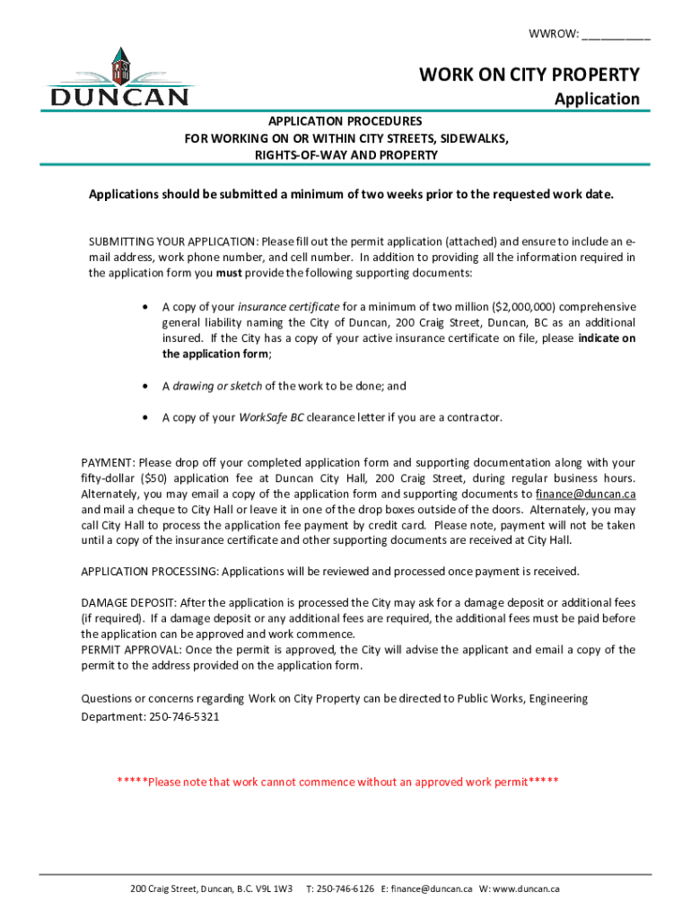 GROW: ___WORK ON CITY PROPERTY Application PROCEDURES FOR WORKING ON OR WITHIN CITY STREETS, SIDEWALKS, RIGHTSOFWAY AND PROPERTY Applications should be submitted a minimum of two weeks prior to the
