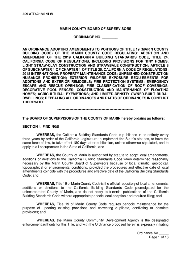 BOS ATTACHMENT #1MARIN COUNTY BOARD OF SUPERVISORS ORDINANCE NO. ___AN ORDINANCE ADOPTING AMENDMENTS TO PORTIONS OF TITLE 19 (MARIN COUNTY BUILDING CODE) OF THE MARIN COUNTY CODE REGULATING: ADOPTION
