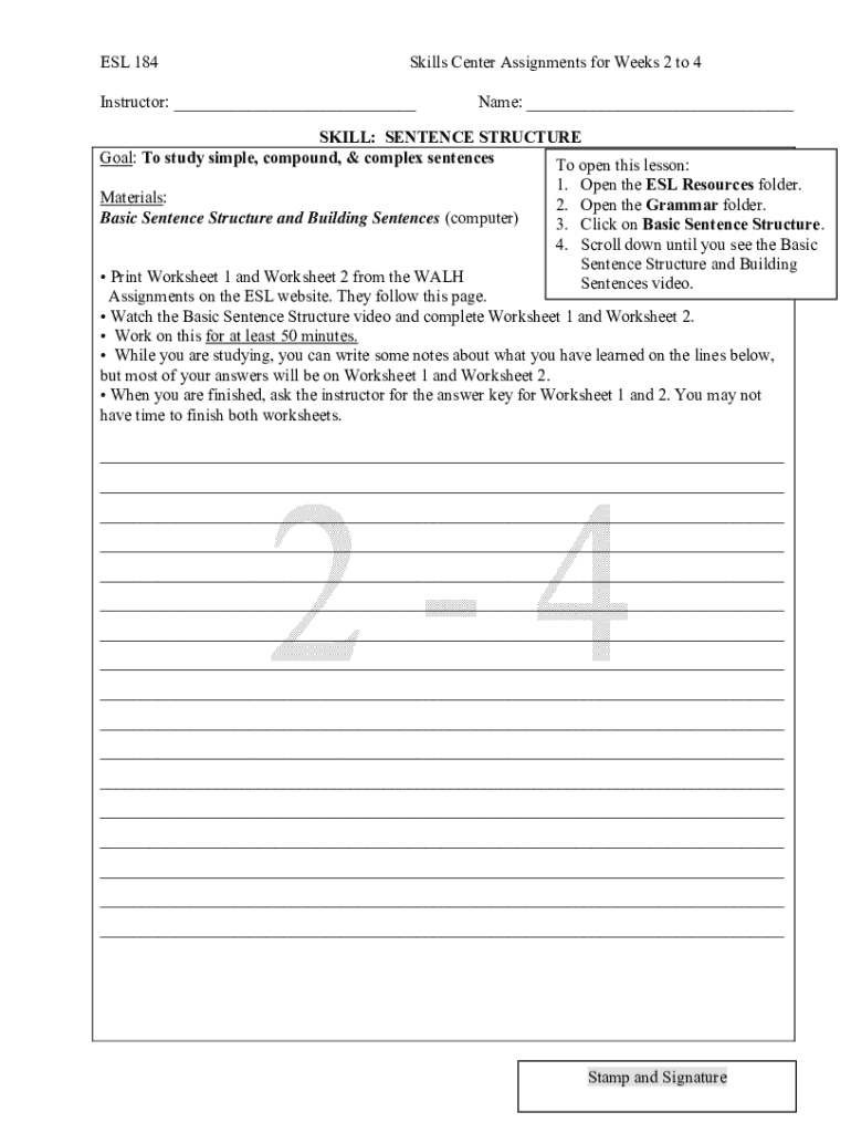 ESL 184Skills Center Assignments for Weeks 2 to 4Instructor: ___Name: ___SKILL: SENTENCE STRUCTURE Goal: To study simple, compound, & complex sentences To open this lesson: 1. Open the ESL Resources
