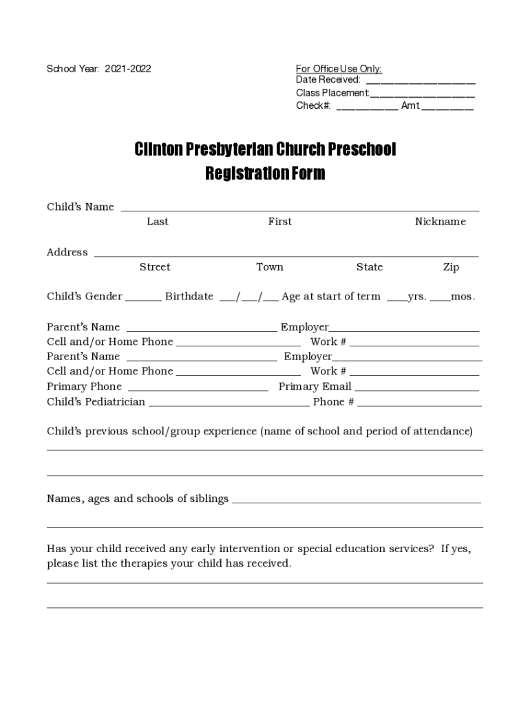School Year:20212022For One Use Only:Date Received: ___Class Placement:___Check#: ___ Amt.___Clinton Presbyterian Church Preschool Registration Form Child's Name ___ Last First Nickname Address ___