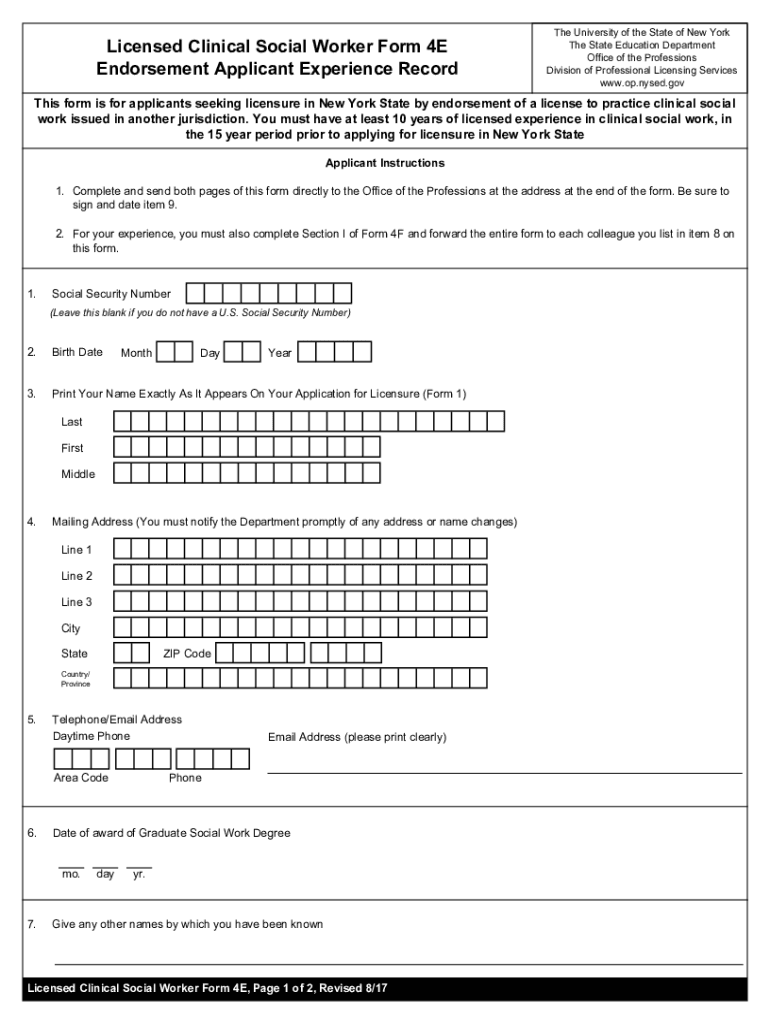 Licensed Clinical Social Worker Form 4E Endorsement Applicant Experience Record University of the State of New York The State Education Department Office of the Professions Division of Professional