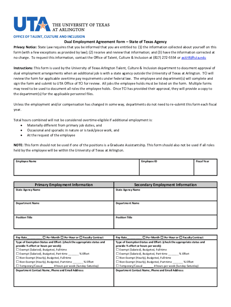 OFFICE OF TALENT, CULTURE AND INCLUSIONInstructions for Request for Dual Employment with another Texas State Agency Form New Hires 1. Candidates for employment are required to disclose whether they