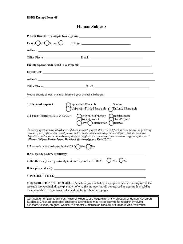 HERB Exempt Form 05Human Subjects Project Director/ Principal Investigator: Faculty StaffStudentCollege:Address: Office Phone:Email:Faculty Sponsor (Student/Class Project): Department: Address: Office