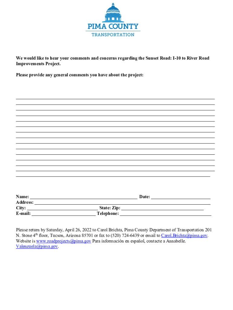 We would like to hear your comments and concerns regarding the Sunset Road: I10 to River Road Improvements Project. Please provide any general comments you have about the project:___ ___ ___ ___ ___