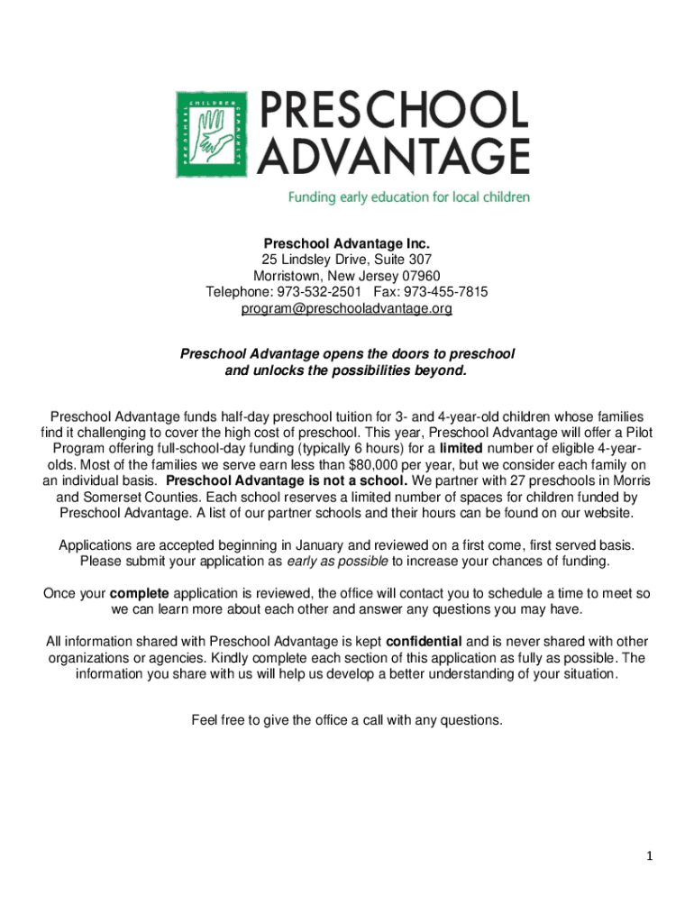 Preschool Advantage Inc. 25 Lindsey Drive, Suite 307 Morristown, New Jersey 07960 Telephone: 9735322501 Fax: 9734557815 program@preschooladvantage.org Preschool Advantage opens the doors to preschool