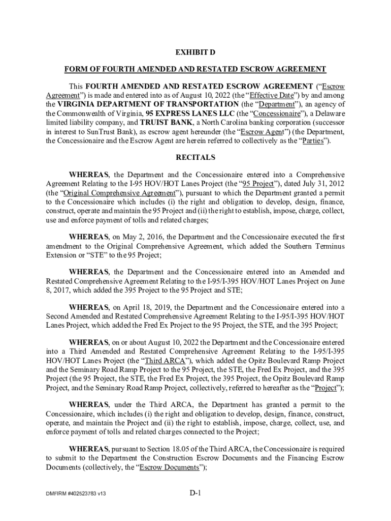 EXHIBIT D FORM OF FOURTH AMENDED AND RESTATED ESCROW AGREEMENT This FOURTH AMENDED AND RESTATED ESCROW AGREEMENT (Escrow Agreement) is made and entered into as of August 10, 2022 (the Effective Date)