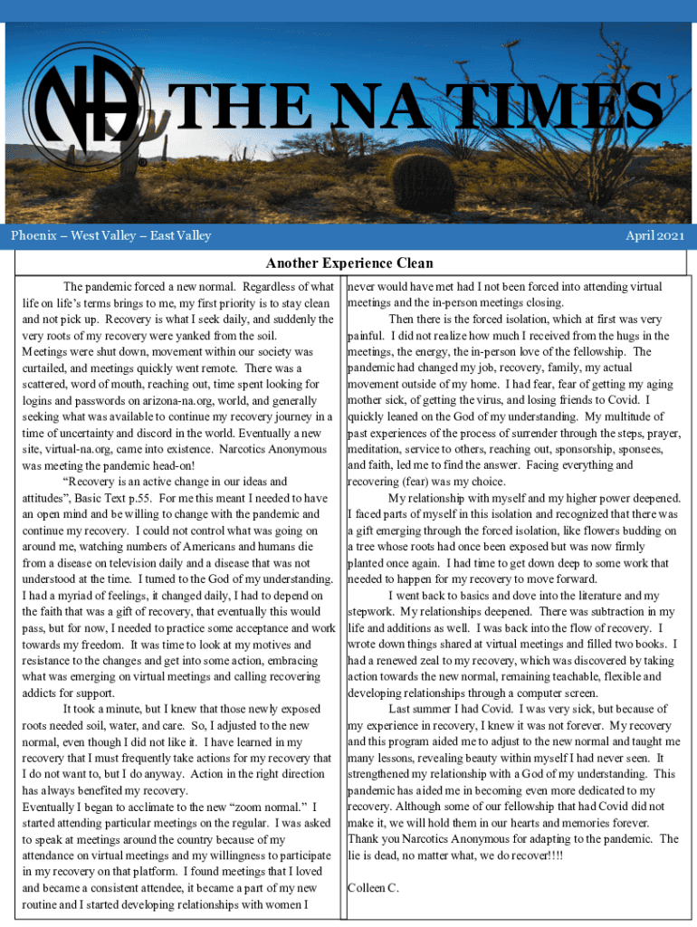 THE NA TIMES Phoenix West Valley East Valley April 2021Another Experience Clean The pandemic forced a new normal. Regardless of what life on lives terms brings to me, my first priority is to stay
