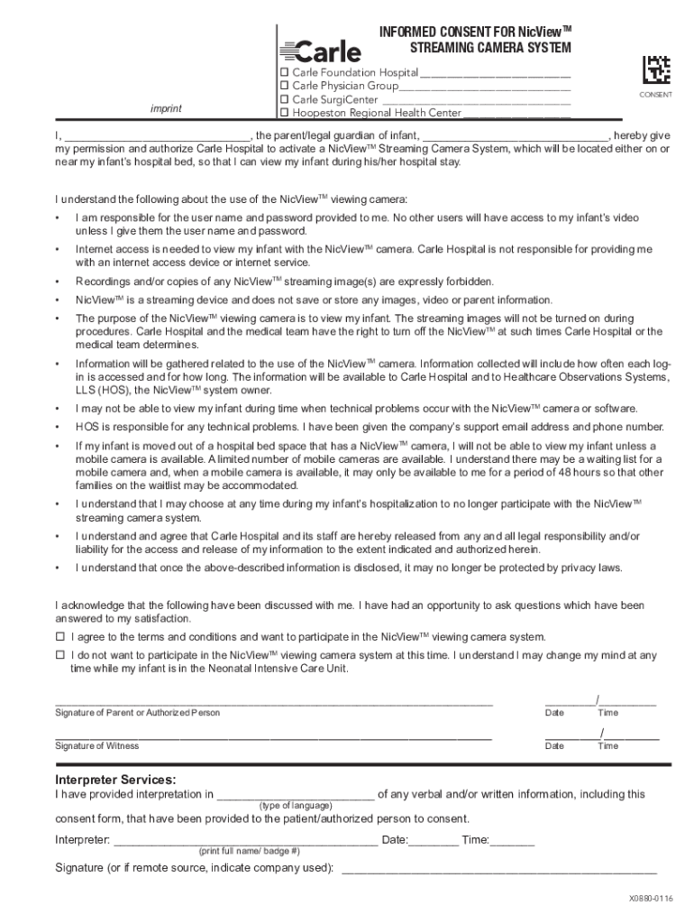 INFORMED CONSENT FOR NicViewTM STREAMING CAMERA SYSTEM o Care Foundation Hospital___ o Care Physician Group___ o Care Supercenter___ o Houston Regional Health Center___imprintCONSENTI, ___, the parent/legal