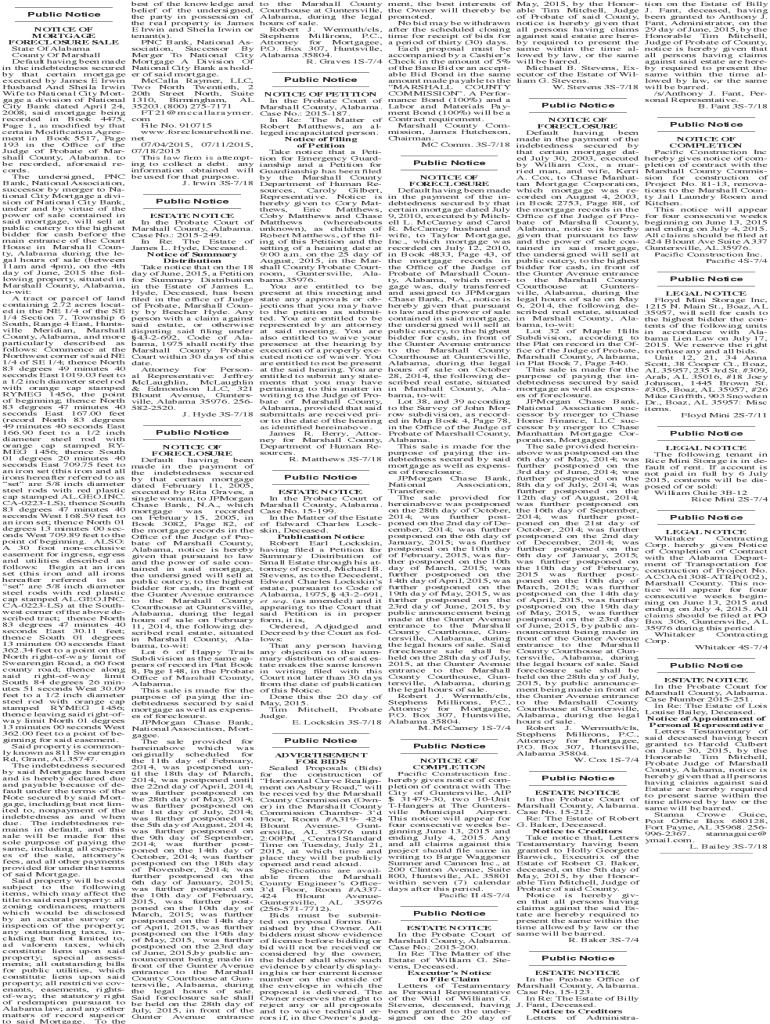 ___ Public Notice___ NOTICE OF MORTGAGE FORECLOSURE SALE State Of Alabama County Of Marshall Default having been made in the indebtedness secured by that certain mortgage executed by James E Irwin