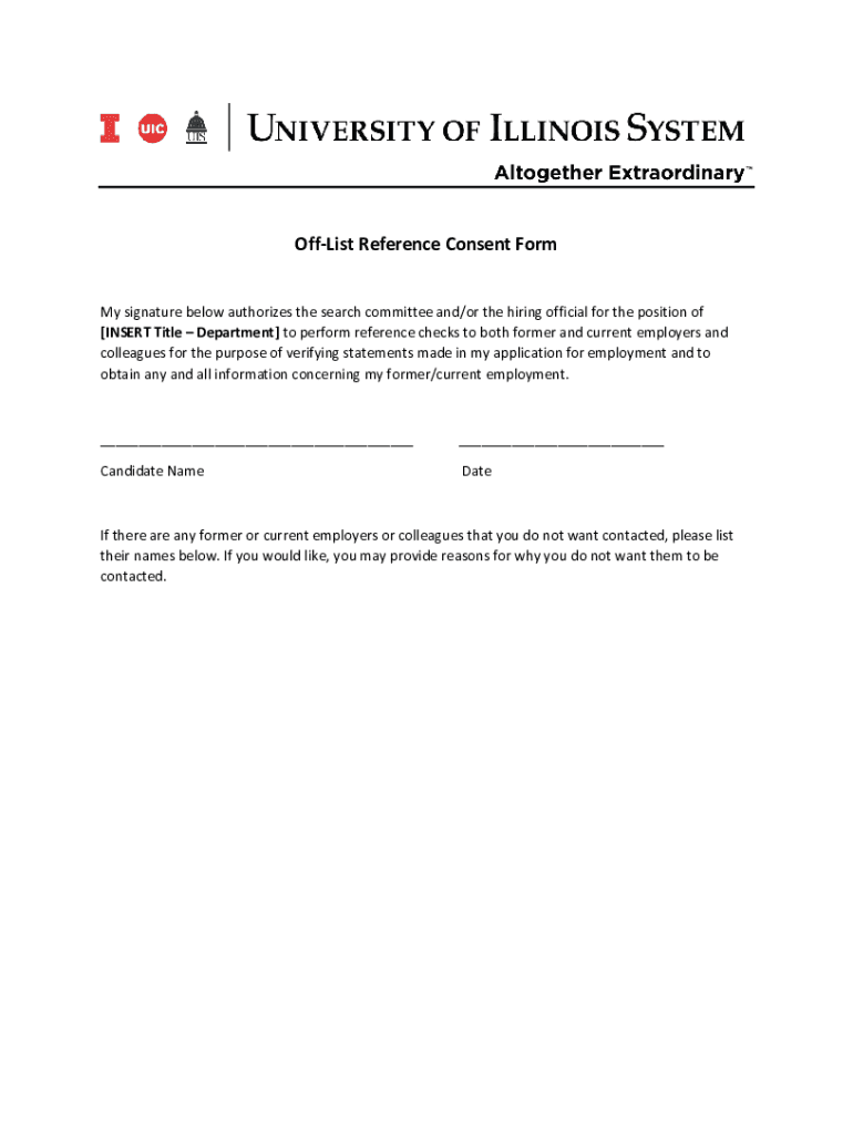Offline Reference Consent Form My signature below authorizes the search committee and/or the hiring official for the position of [INSERT Title Department] to perform reference checks to both former