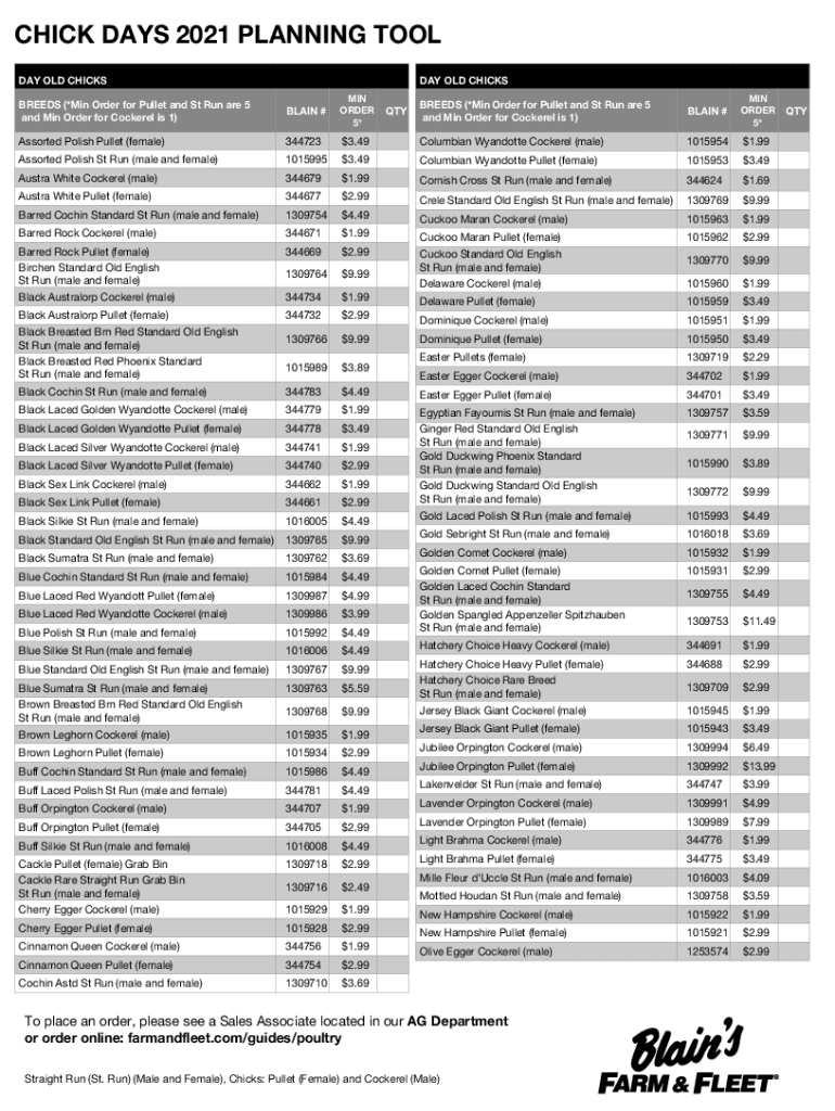 CHICK DAYS 2021 PLANNING TOOL DAY OLD CHICKS OLD CHICKSBREEDS (*Min Order for Pullet and St Run are 5 and Min Order for Cockerel is 1)BRAIN #MIN ORDER 5×BREEDS (*Min Order for Pullet and St Run are