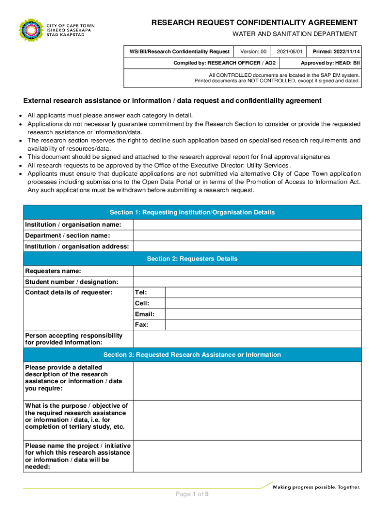 WS/BII/Research Confidentiality RequestVersion: 002021/06/01Compiled by: RESEARCH OFFICER / AO2Printed: 2022/11/14Approved