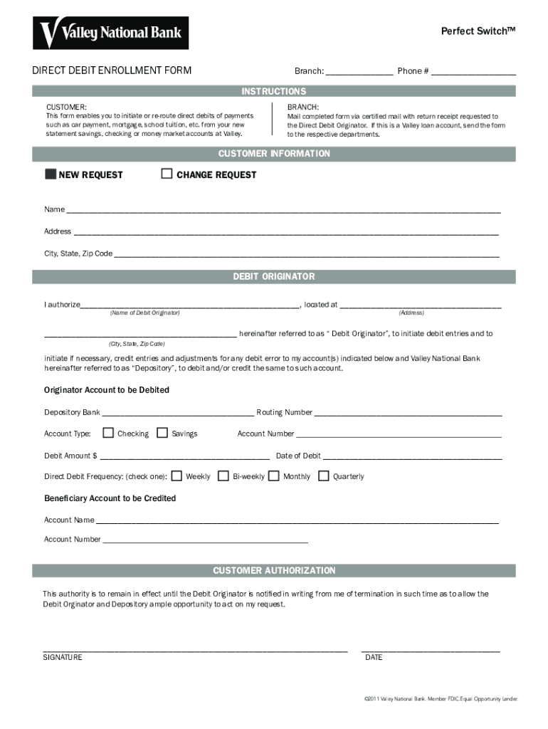 Perfect Switch DIRECT DEBIT ENROLLMENT FORM Branch: ___ Phone # ___ INSTRUCTIONSCUSTOMER:This form enables you to initiate or reroute direct debits of payments such as car payment, mortgage, school