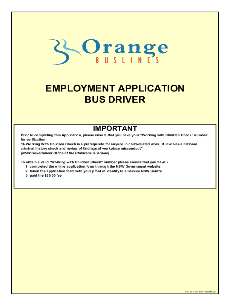 EMPLOYMENT APPLICATION BUS DRIVER IMPORTANTPrior to completing this Application, please ensure that you have your \” Working with Children Check\” number for verification. \” A Working With