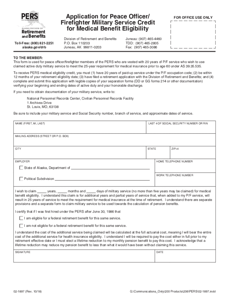 PEERS PUBLIC EMPLOYEES RETIREMENT SYSTEMALASKA DIVISION Retirement and Benefits Toll-free: (800) 8212251 alaska.gov/drbApplication for Peace Officer/ Firefighter Military Service Credits for Medical