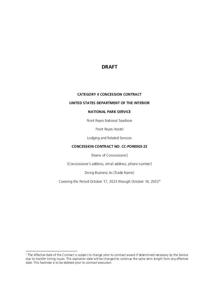 DRAFTCATEGORY II CONCESSION CONTRACT UNITED STATES DEPARTMENT OF THE INTERIOR NATIONAL PARK SERVICE Point Reyes National Seashore Point Reyes Hostel Lodging and Related Services CONCESSION CONTRACT