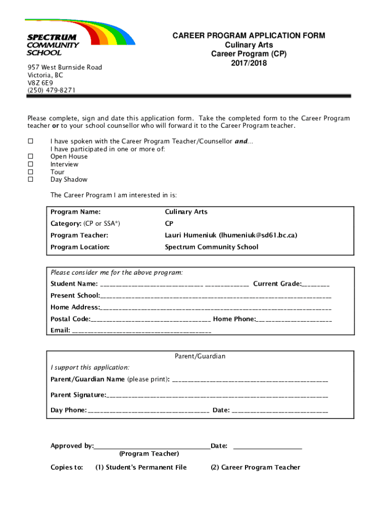 CAREER PROGRAM APPLICATION FORM Culinary Arts Career Program (CP) 2017/2018957 West Burnside Road Victoria, BC V8Z 6E9 (250) 4798271Please complete, sign and date this application form. Take the completed