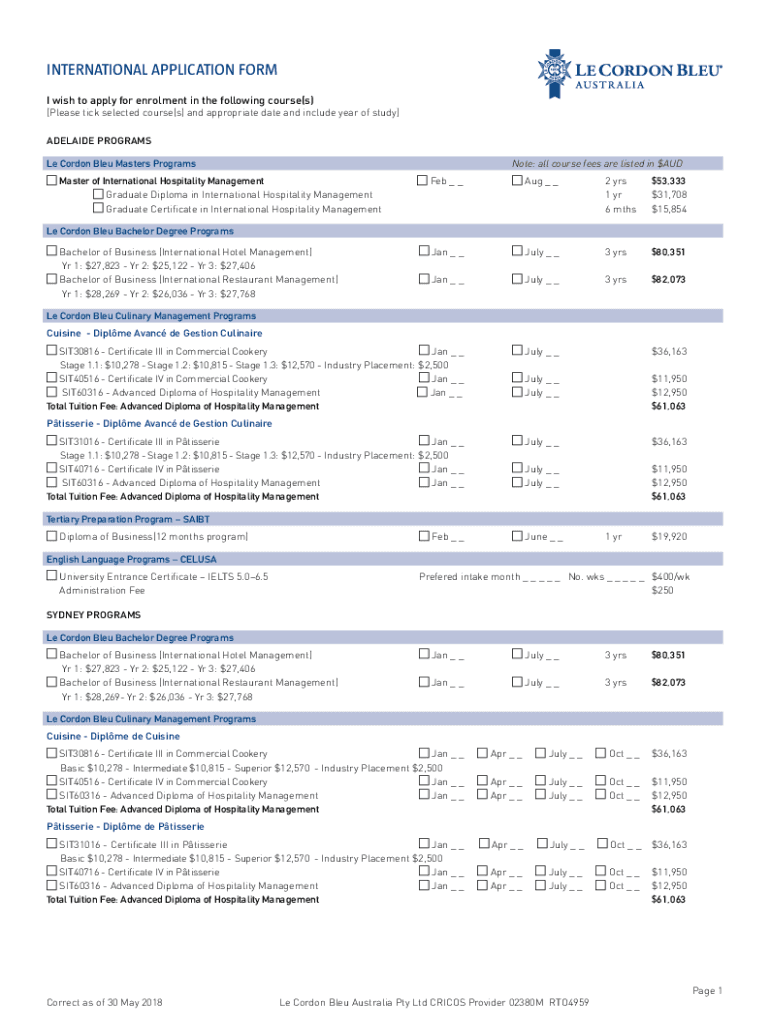 INTERNATIONAL APPLICATION FORM I wish to apply for enrollment in the following course(s)[Please tick selected course(s) and appropriate date and include year of study] ADELAIDE PROGRAMS Le Cordon