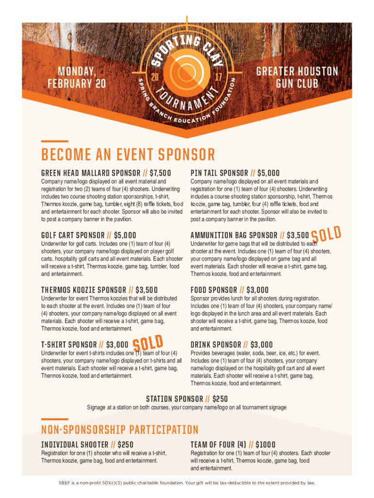 SCHEDULE AT I OTIONAMEDAGANURGREATER HOUSTON GUN CLUBUINRNT17NL AY20TO BSPRMONDAY, FEBRUARY 20SPORTING BECOME AN EVENT SPONSOR GREEN HEAD MALLARD SPONSOR // $7,500PIN TAIL SPONSOR // $5,000GOLF CART