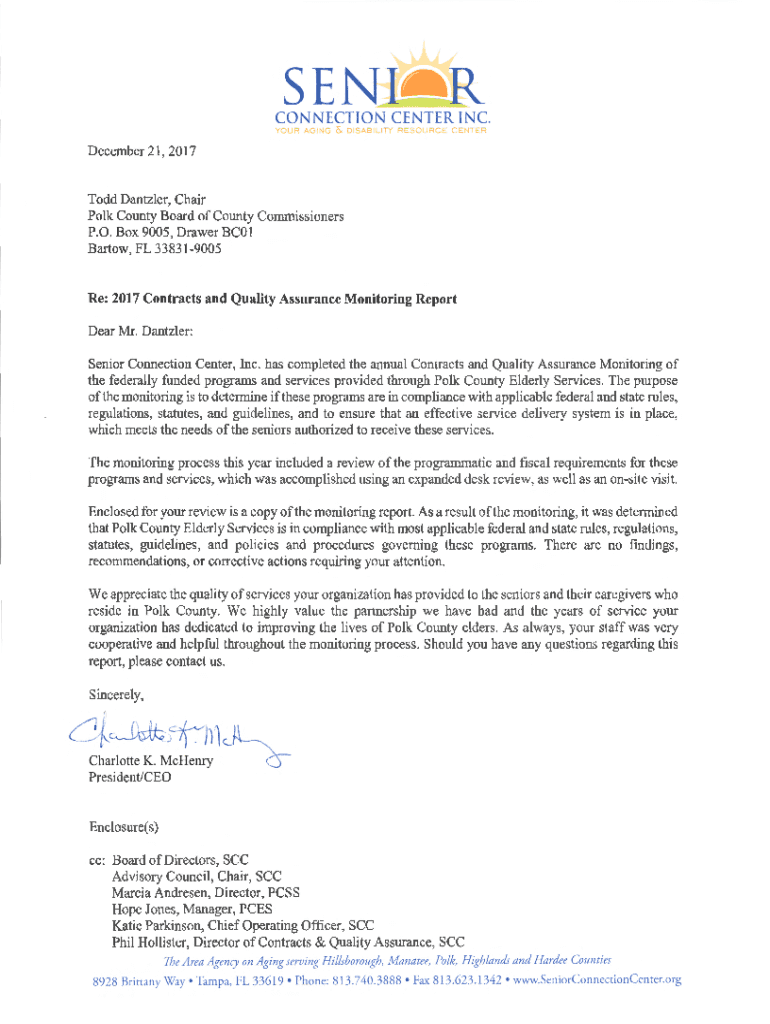 CONNECTION CENTER INC. December 21, 2017Todd Antler, Chair Polk County Board of County Commissioners P.O. Box 9005, Drawer Col Barton, FL 338319005Re: 2017 Contracts and Quality Assurance Monitoring
