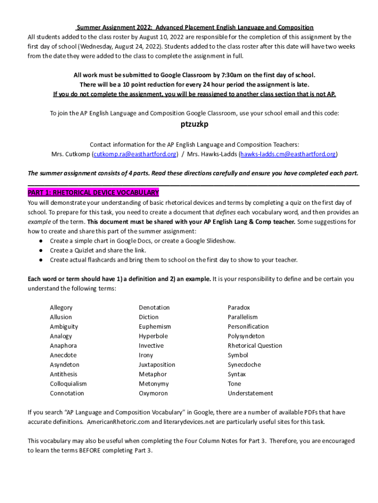 Get the free AP Lang & Comp Summer Assignment Directions
