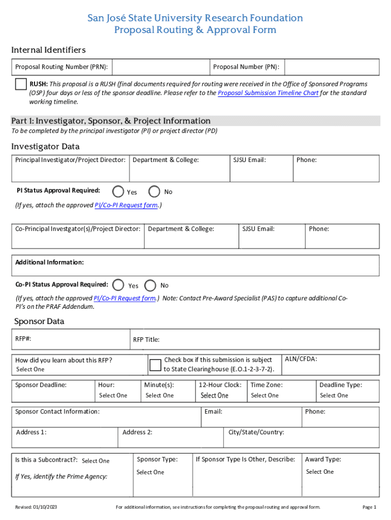 San Jo's State University Research Foundation Proposal Routing & Approval Form Internal Identifiers Proposal Routing Number (PRN):Proposal Number (IN):RUSH: This proposal is a RUSH (final documents