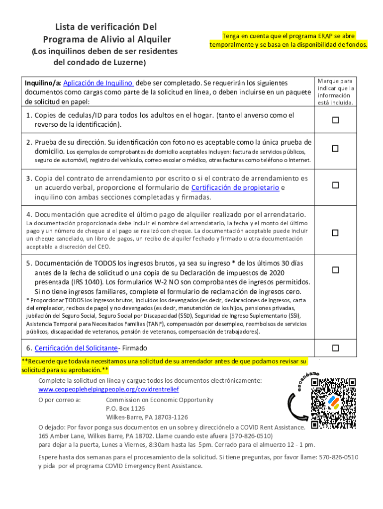 List de verification Del Program de Alivio all Aquifer (Los inquiries Eben de SER residents Del condado de Luzerne)Tonga en cent Que El program ERAP SE are temperament y SE base en la disponibilidad