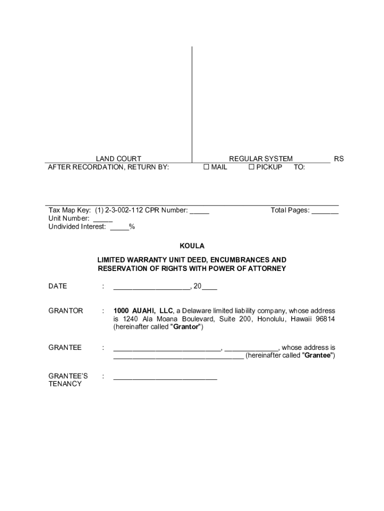 LAND COURT AFTER DECORATION, RETURN BY: Malta Map Key: (1) 23002112 CPR Number: ___ Unit Number: ___ Undivided Interest: ___REGULAR SYSTEM PICKUP TO:Total Pages: ___KOALA LIMITED WARRANTY UNIT DEED,