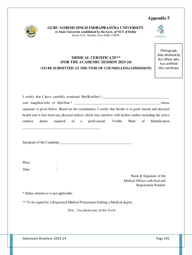 Appendix 5 GURU GOING SINGH INDRAPRASTHA UNIVERSITY (A State University established by the Govt. of NCT of Delhi) Sector16C, Dark, New Delhi110078MEDICAL CERTIFICATE** (FOR THE ACADEMIC SESSION 202324)