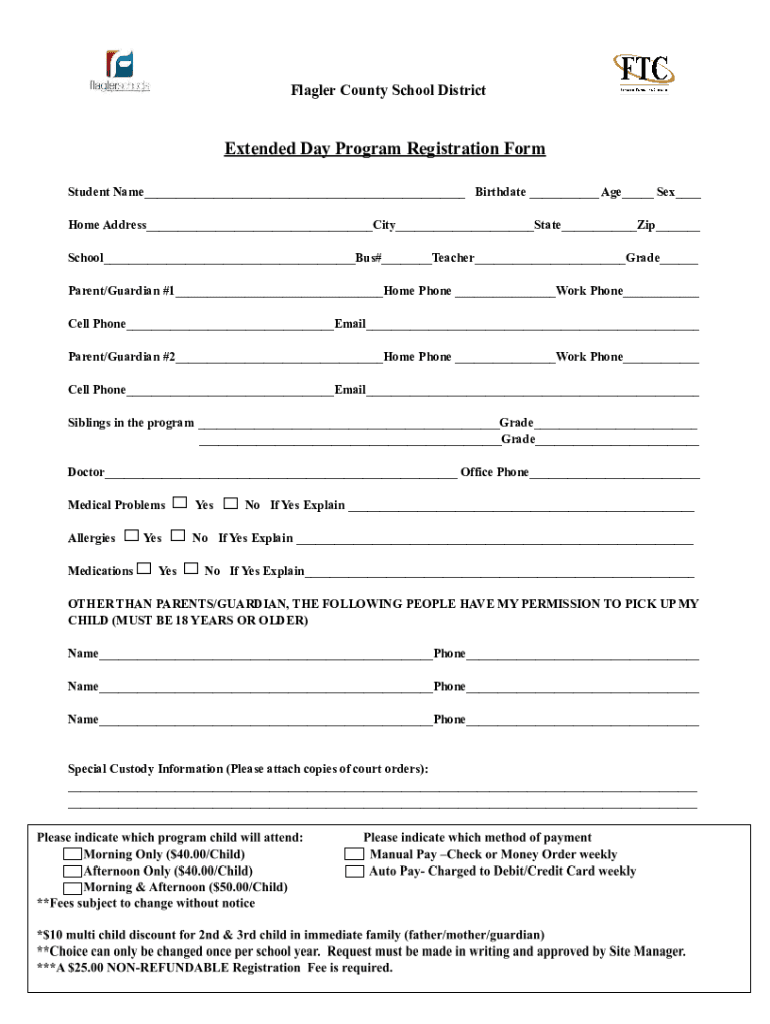 Flagler County School DistrictExtended Day Program Registration Form Student Name___ Birthdate ___ Age___ Sex___ Home Address___City___State___Zip___ School___Bus#___Teacher___Grade___ Parent/Guardian