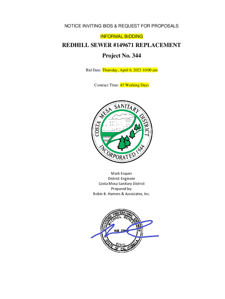 NOTICE INVITING BIDS & REQUEST FOR PROPOSALS INFORMAL BIDDINGREDHILL SEWER #149671 REPLACEMENT Project No. 344 Bid Date: Thursday, April 6, 2023 10:00 contract Time: 45 Working Days Mark Esther District