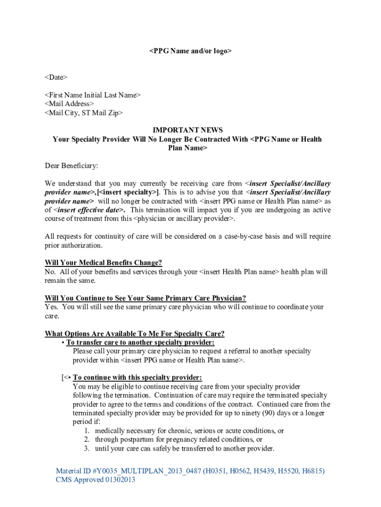 RPG Name and/or logo Date First Name Initial Last Name Mail Address Mail City, ST Mail Zip IMPORTANT NEWS Your Specialty Provider Will No Longer Be Contracted With RPG Name or Health Plan Name Dear